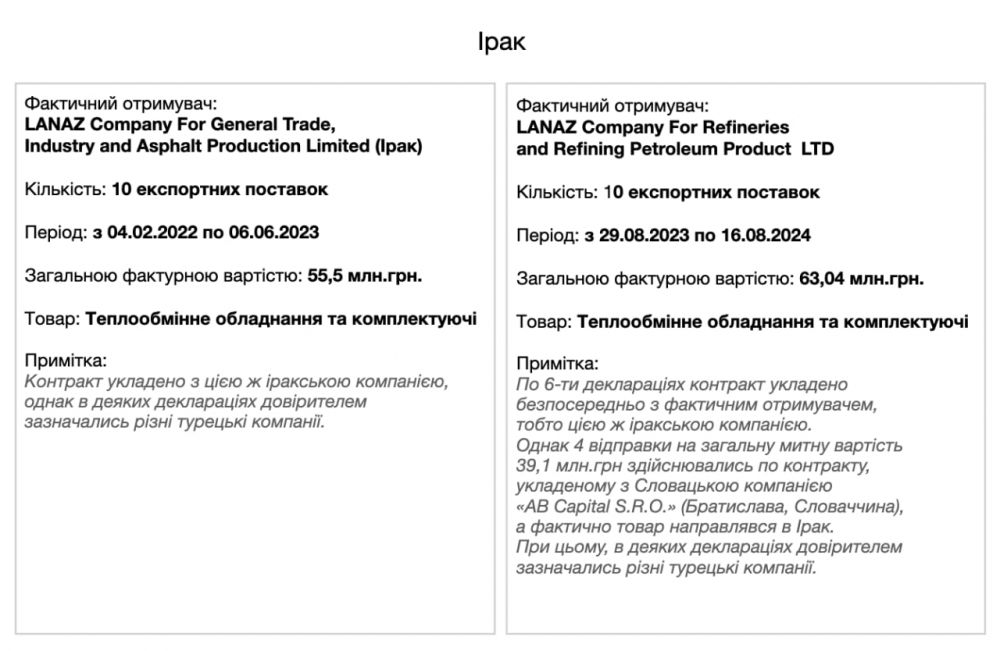 - Фактичний отримувач: Марыйская база №2 УКПО ГК «Туркменгаз» (Туркменістан) – 4 поставки, з 28.02.2023 по 29.03.2023, фактурна вартість 23,2 млн.грн. Товар – частини теплообмінного обладнання. При цьому контракт укладено з «Corimpex Investments LTD » (Великобританія, Лондон).