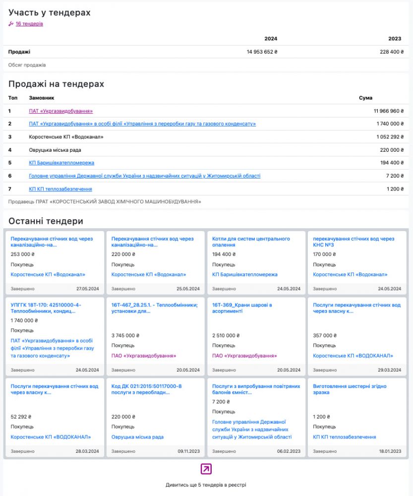 Крім того, що компанія ПрАТ «Коростенський завод хімічного машинобудування», ЄДРПОУ 00217679 з орбіти Сергія Тищенка регулярно виграє державні тендери на мільйони гривень (зокрема, замовлення від ПАТ «Укргазвидобування»), а й активно співпрацюють з закордонними фірмами сумнівної репутації.