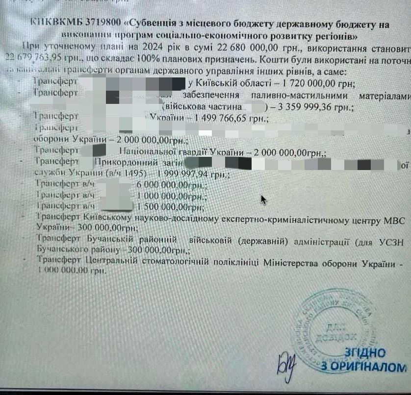 Так, 2 мільйони гривень було передано прикордонній службі, яка не діє на території Гостомеля, а ще 1 мільйон — поліклініці Міністерства оборони, що не обслуговує місцевих мешканців. За свідченнями, саме в цій медичній установі Смаль проходив особисте лікування, включно з протезуванням зубів, скориставшись своїм службовим статусом.